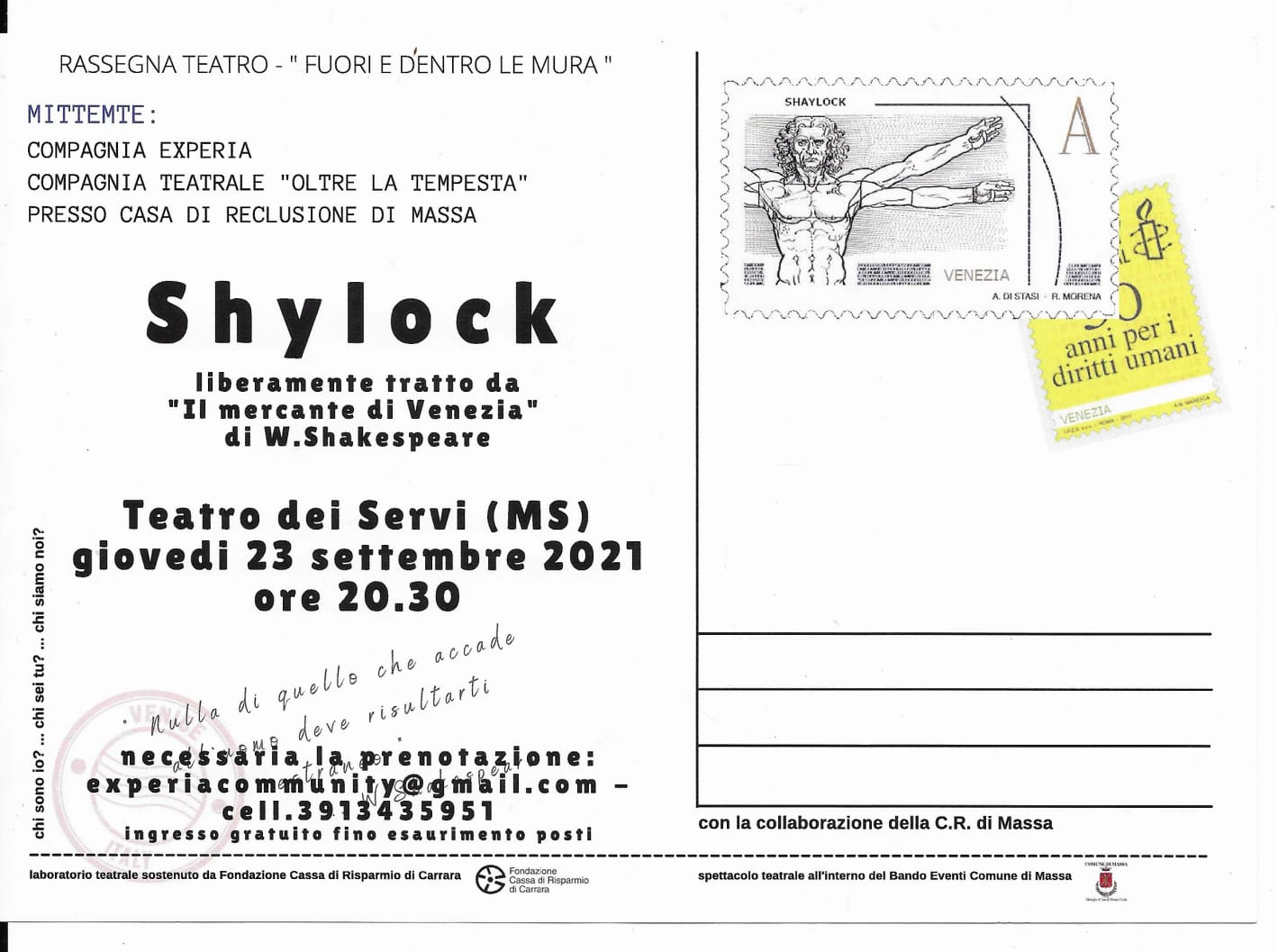 Il Cpia di Massa Carrara, nell'ambito della rassegna teatrale 'Fuori e dentro le mura', è lieto di presentare 'Shylock' - liberamente tratto da W. Shakespeare-. L'opera verrà messa in scena al teatro dei Servi a Massa il 23 settembre alle ore 20.30 dalla compagnia teatrale 'Oltre la Tempesta' della CdR di Massa in collaborazione con la compagnia Experia.