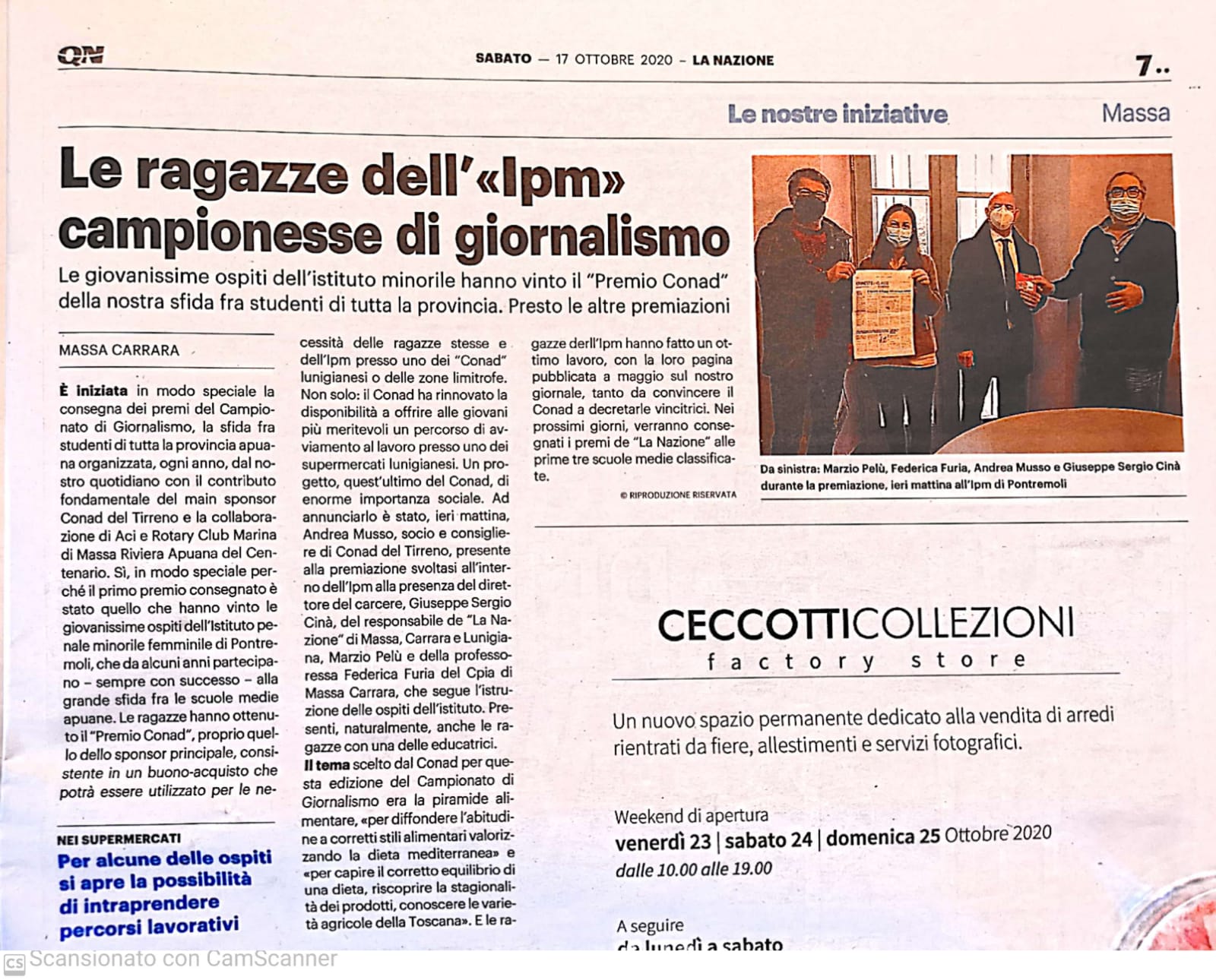 Le ragazze dell'IPM, guidate dalla professoressa Federica Furia, hanno vinto il primo premio del concorso di giornalismo 'Premio Conad', indetto per tutte le scuole medie della provincia apuana dalla testata giornalistica La Nazione e avente come sponsor Conad Tirreno, ACI, Rotary Club Marina di Massa Riviera Apuana del Centenario. Il tema del concorso era 'La piramide alimentare' e le ragazze hanno fatto un ottimo lavoro. Il premio offerto da Conad, oltre ad un buono acquisto da utilizzare presso il supermercato, consiste nella possibilità, per le più meritevoli, di poter partecipare ad un percorso di avviamento al lavoro presso un supermercato della Lunigiana.
