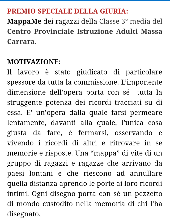 Venerdì 31 maggio i ragazzi del Cpia di Massa Carrara sono stati premiati a Seravezza nell'ambito della manifestazione MemoFest - 3° Festival della Memoria - per un elaborato molto particolare e suggestivo che hanno prodotto sotto la guida della professoressa di Arte Erica Gambini dal titolo 'MappaMe'. I testi dell'opera e i disegni sono sono stati raccolti in un libro dalla docente stessa.